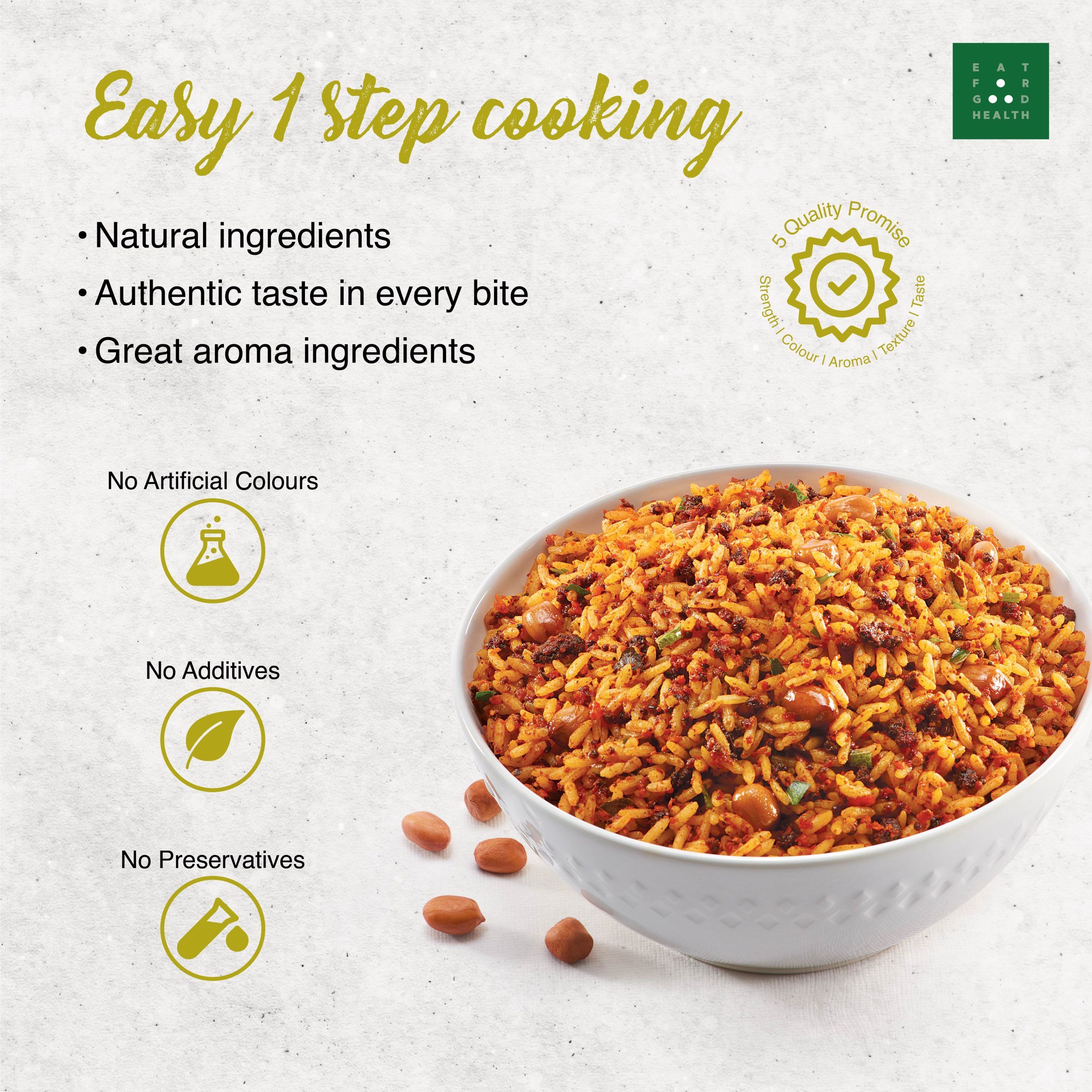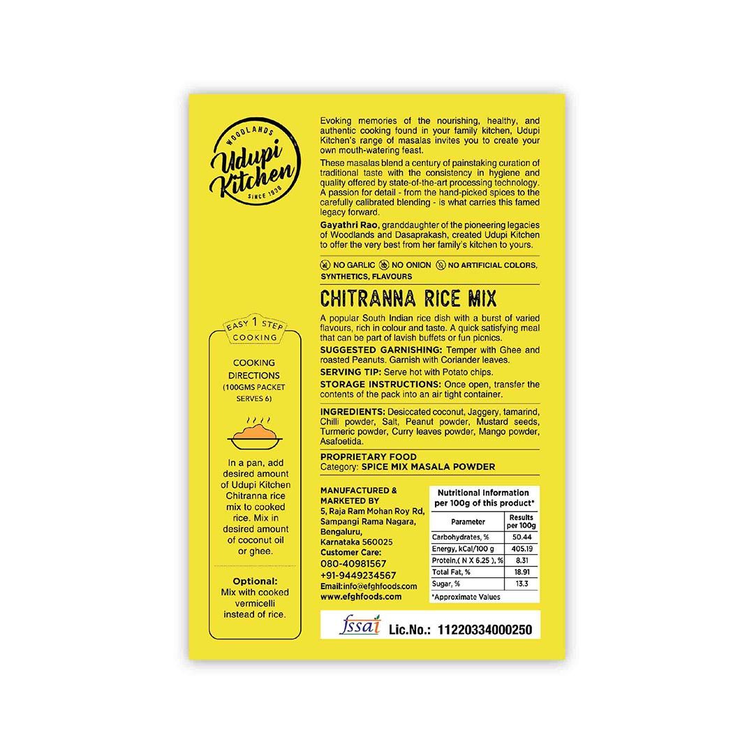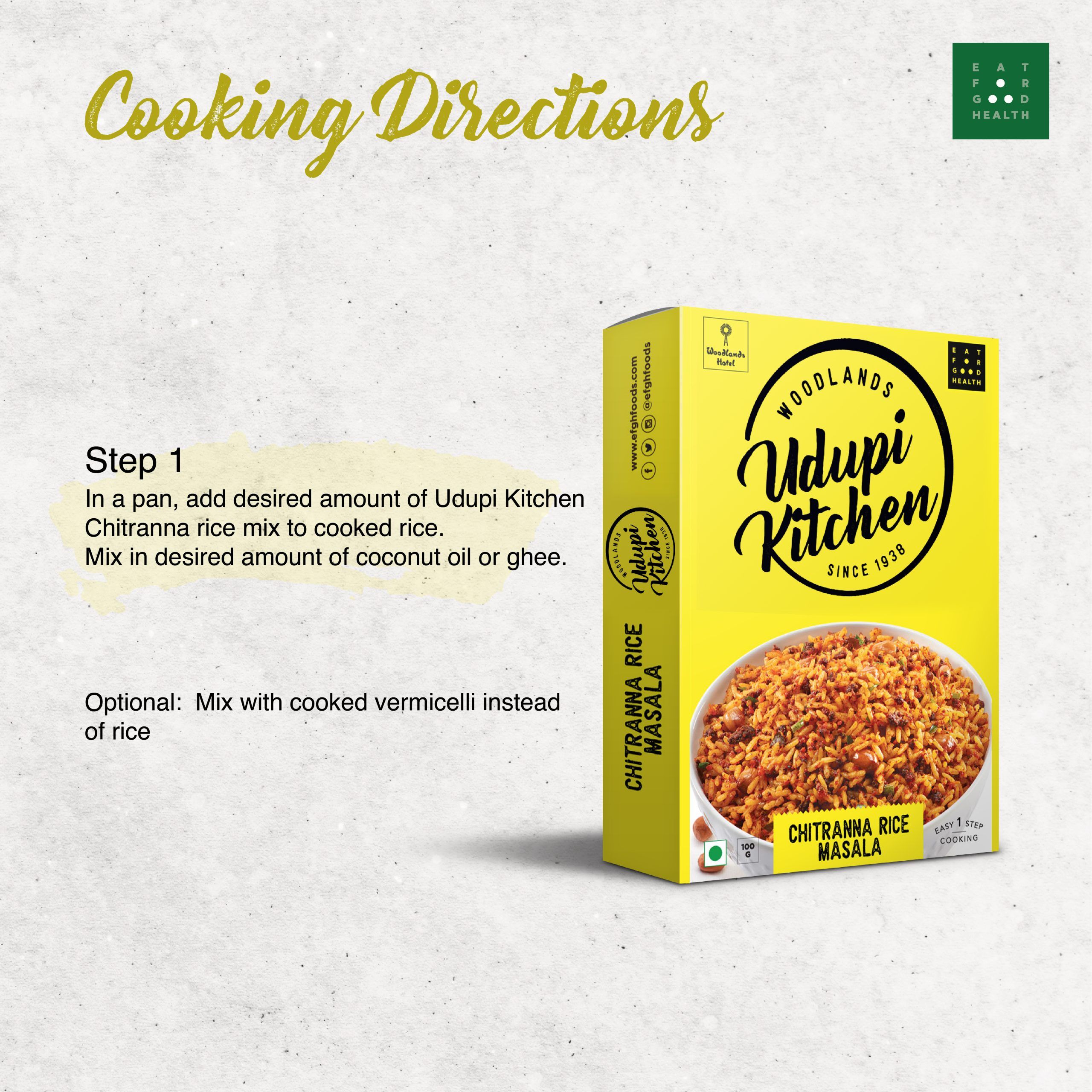 ■ In a pan, add desired amount of Udupi Kitchen Chitranna rice mix to cooked rice. Mix in desired amount of coconut oil or ghee.Optional:  Mix with cooked vermicelli instead of rice