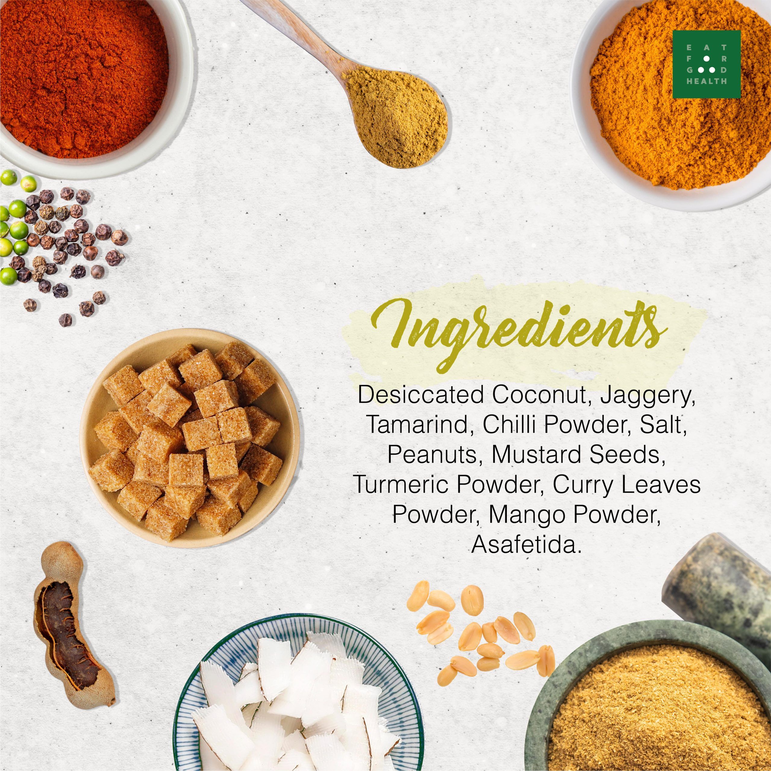 Desiccated Coconut, Jaggery, Tamarind, Chilli Powder, Salt, Peanuts, Mustard Seeds, Turmeric Powder, Curry Leaves Powder, Mango Powder, Asafetida.