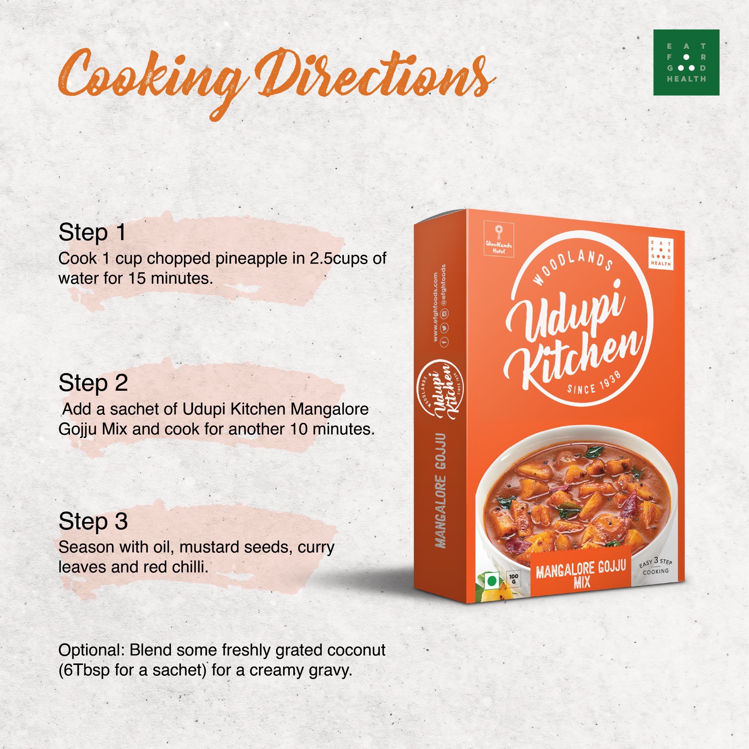 | INGREDIENTS: Black Gram, Split Chickpeas (Chana Dal), Chilli Powder, Sesame Seeds Powder Desiccated Coconut, Curry Leaves Powder, Fenugreek Powder, Jaggery Powder, Salt, Tamarind Powder. COOKING DIRECTIONS: ■ Cook 1 cup chopped pineapple in 2.5cups of water for 15 minutes. ■ Add a sachet of Udupi Kitchen Mangalore Gojju Mix and cook for another 10 minutes. ■ Season with oil, mustard seeds, curry leaves and red chilli. Optional – Blend some freshly grated coconut (6Tbsp for a sachet) for a creamy gravy. Variations – Gojju can be made with hog plum, raw mango, karela, fried bhindi, capsicum, green apple, pomegranate and eggplant. |