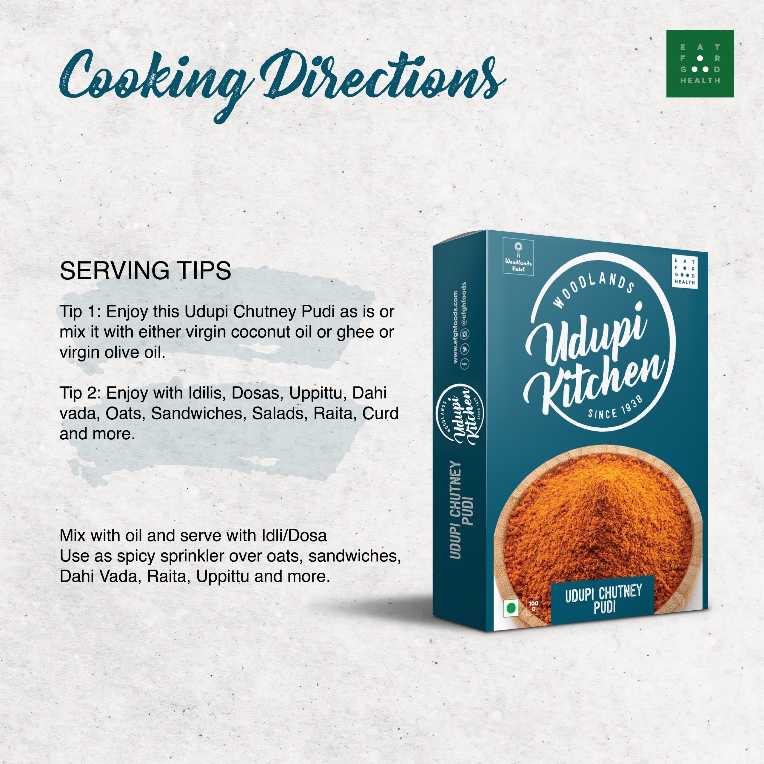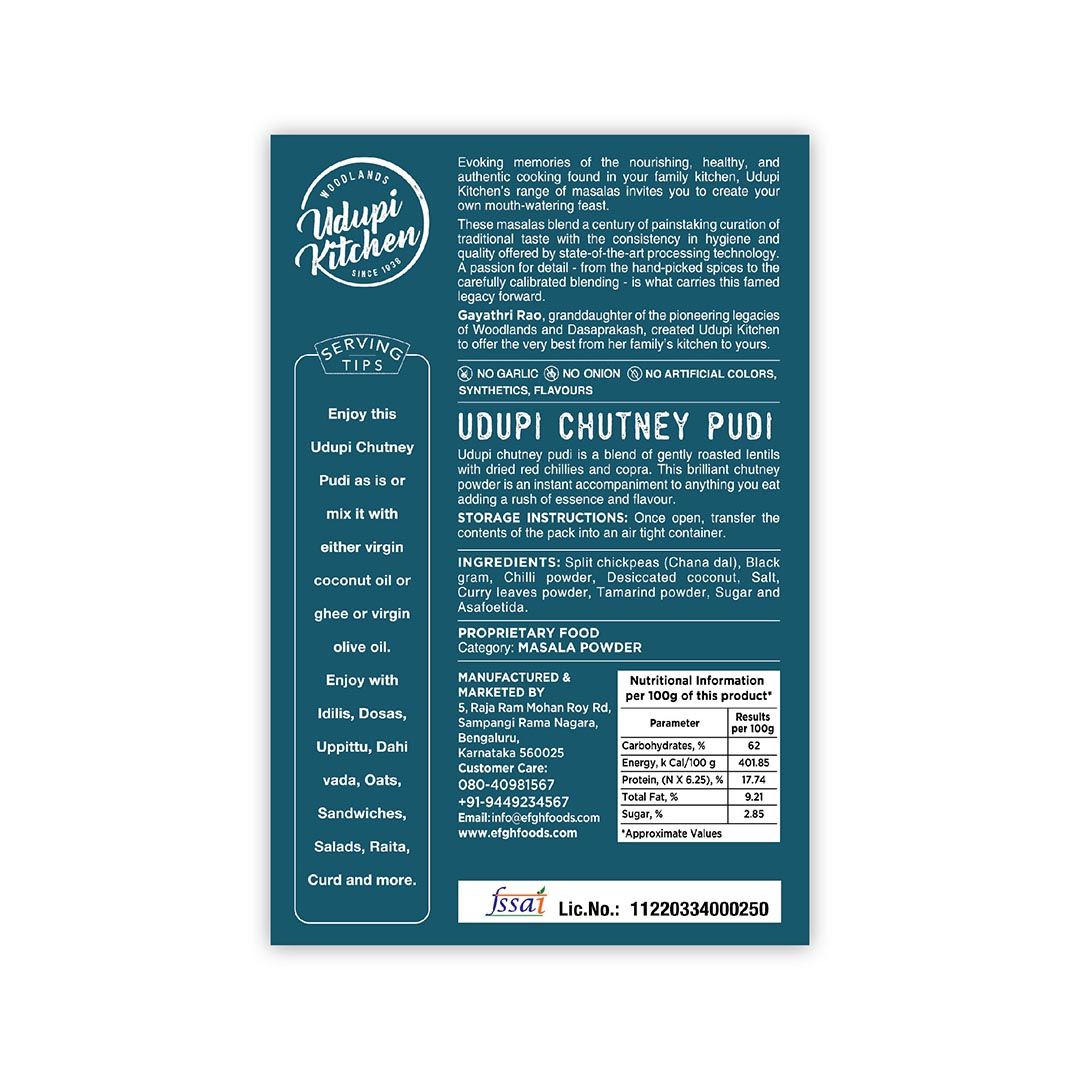 Udupi Kitchen’s iconic chutney powder is a culinary marvel that instantly elevates the flavor of any dish you prepare. Renowned for its extraordinary versatility, you can unleash your culinary creativity by incorporating it into soups or sprinkling it over pizzas and pastas to savor the delightful fusion of flavors. Crafted from authentic, hand-picked spices and ingredients, our Pudi is a harmonious blend of traditional tastes and a catalyst for modern culinary innovations. It’s ideal for enhancing the flavors of your everyday meals, whether you’re savoring a mouthwatering podi dosa or a delightful idli; our chutney pudi makes the perfect companion. Order Udupi Pudi online at our website or choose to shop at Woodlands hotel and other partnered outlets near you. Elevate your dining experience with this versatile condiment that pairs seamlessly with a variety of dishes. INGREDIENTS: Split Chickpeas (Chana Dal), Black Gram,Chilli Powder,Desiccated Coconut, Salt, SERVING TIPS Tip 1: Enjoy this Udupi Chutney Pudi as is or mix it with either virgin coconut oil or ghee or virgin olive oil. Tip 2: Enjoy with Idilis, Dosas, Uppittu, Dahi vada, Oats, Sandwiches, Salads, Raita, Curd and more. Serving Tip Mix with oil and serve with Idli/Dosa * Use as spicy sprinkler over oats, sandwiches, Dahi Vada, Raita, Uppittu and more |